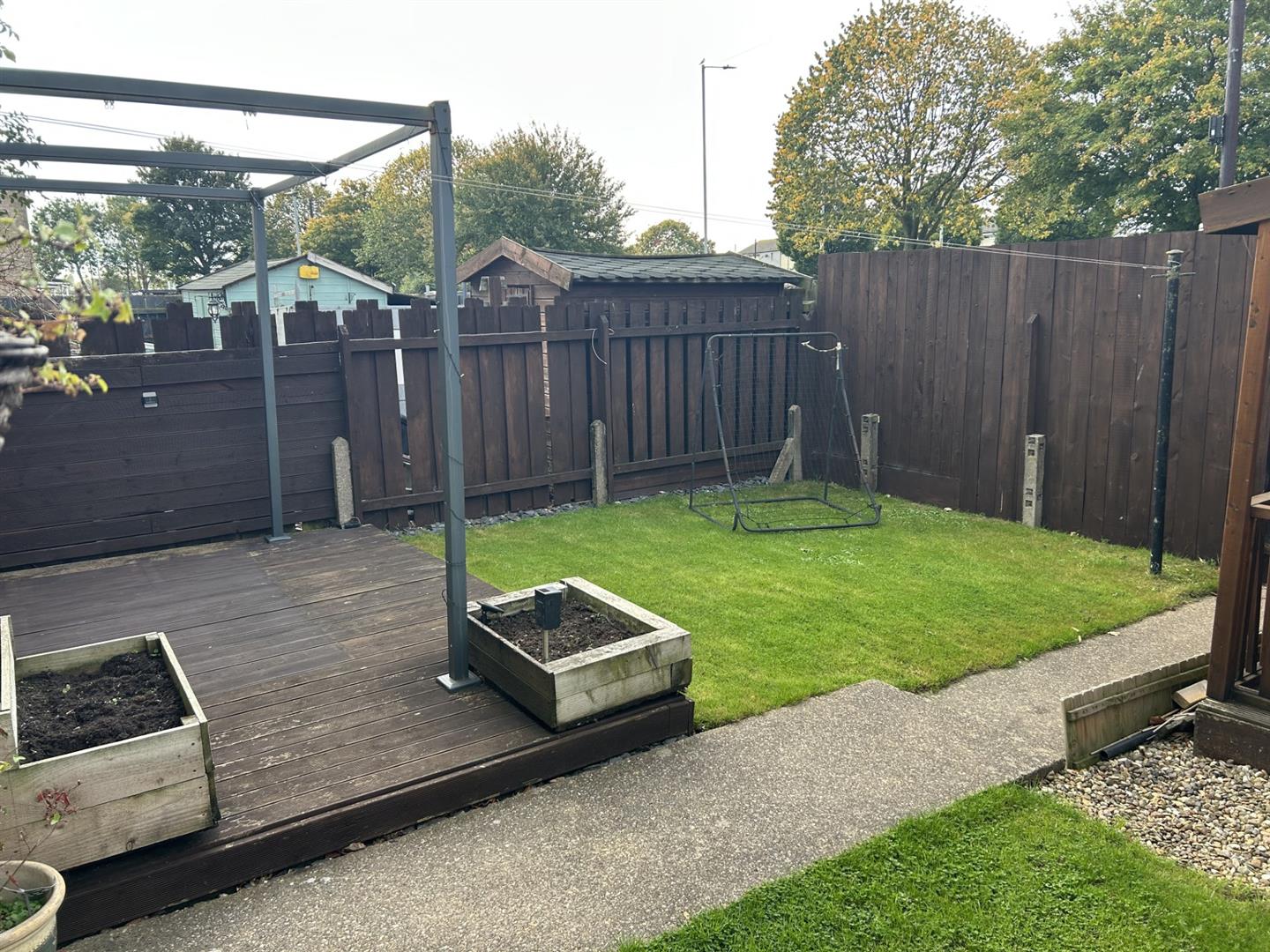 Fenced rear garden with gate. the garden has grassed areas with path leading to the garden gate. gravelled area with garden shed a decked area with metal pergola making a perfect seating area