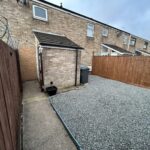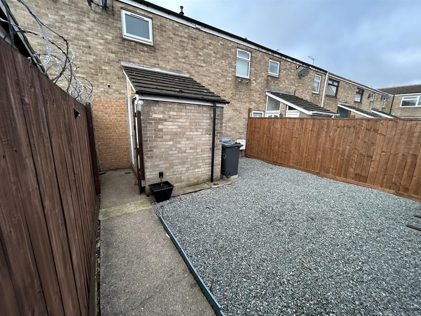 fenced garden with gate, there is a concrete path leading to the property with a good sized gravelled garden.