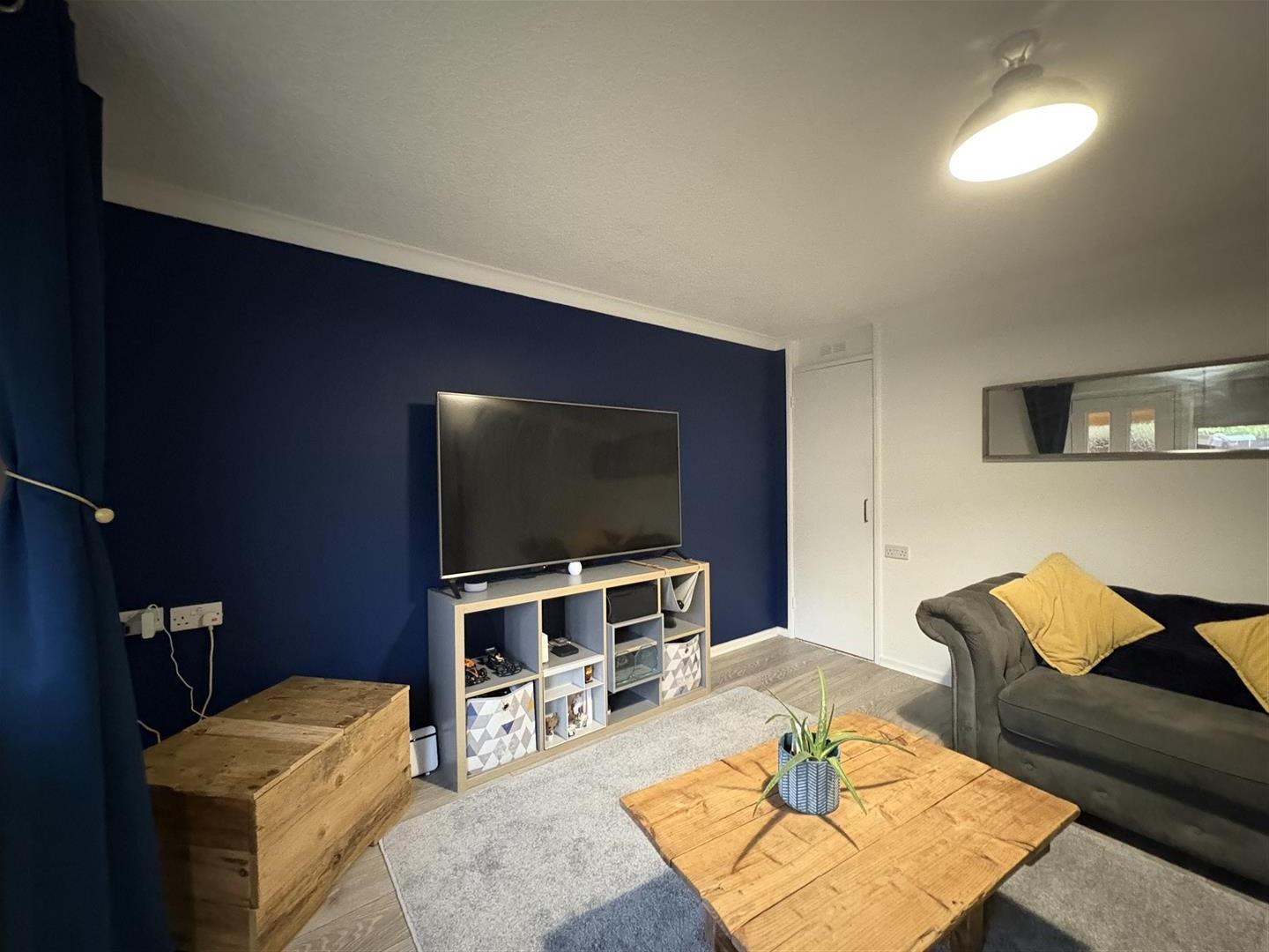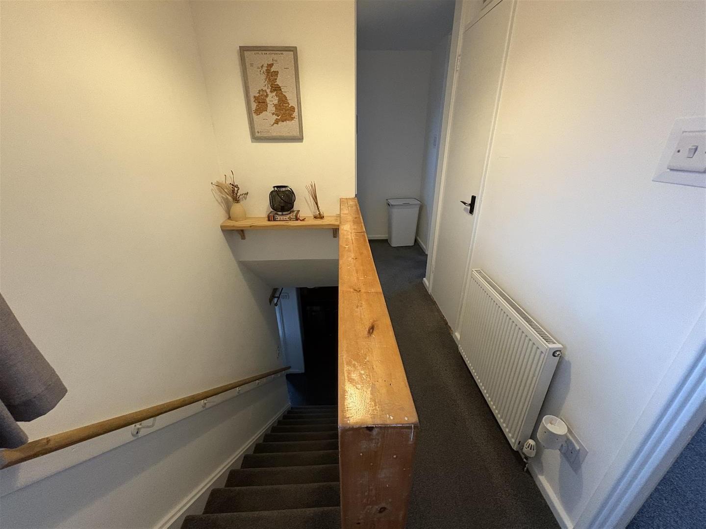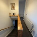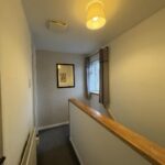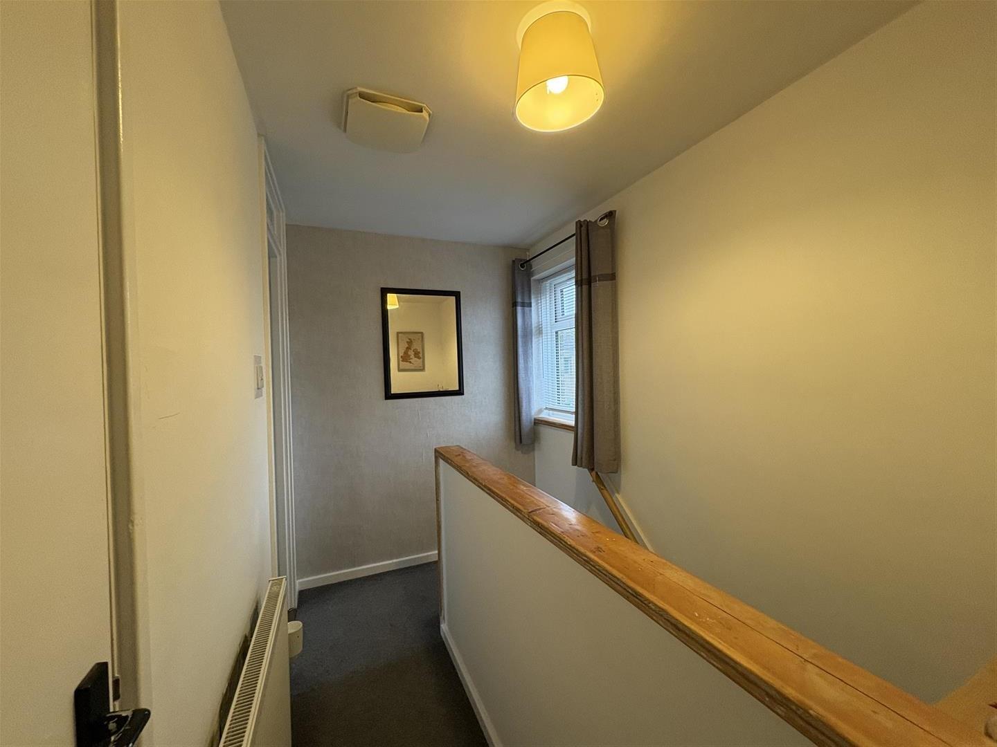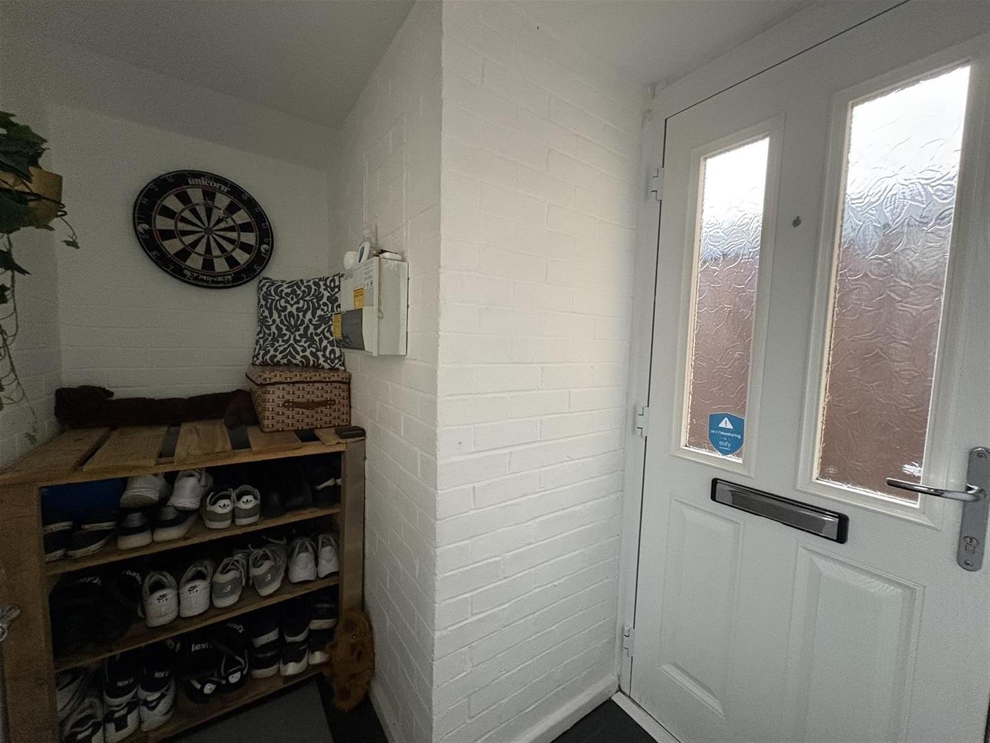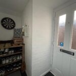 Painted in white emulsion with feature wall papered in grey. wooden accents. upvc window overlooking the front garden. Storage area near the front door.