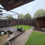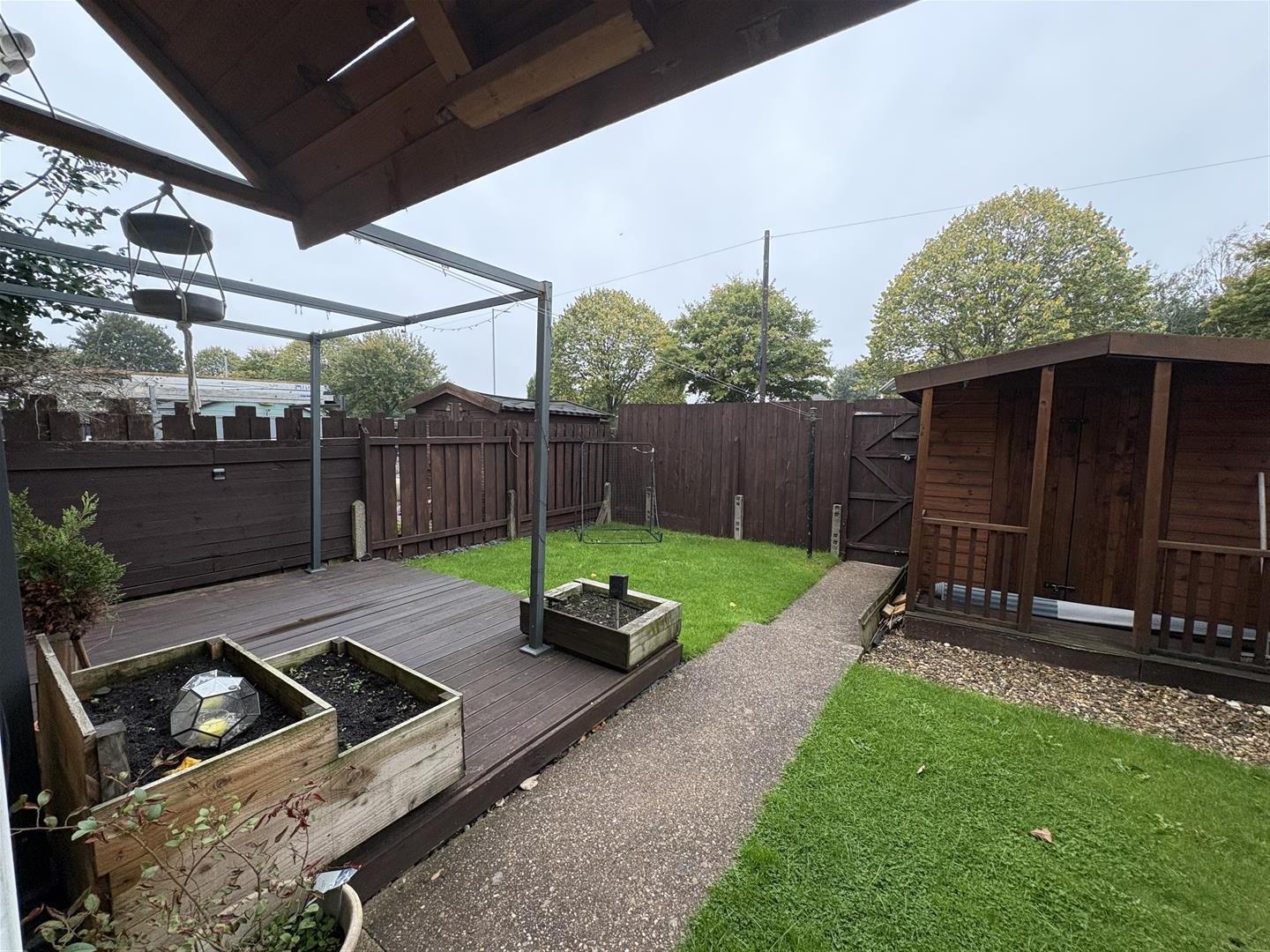 Fenced rear garden with gate. the garden has grassed areas with path leading to the garden gate. gravelled area with garden shed a decked area with metal pergola making a perfect seating area