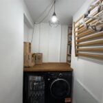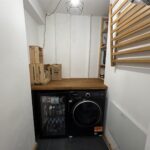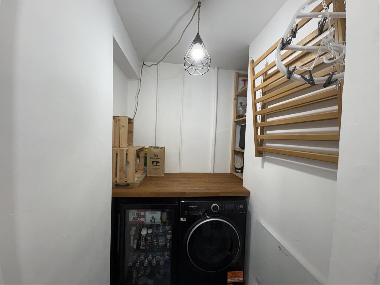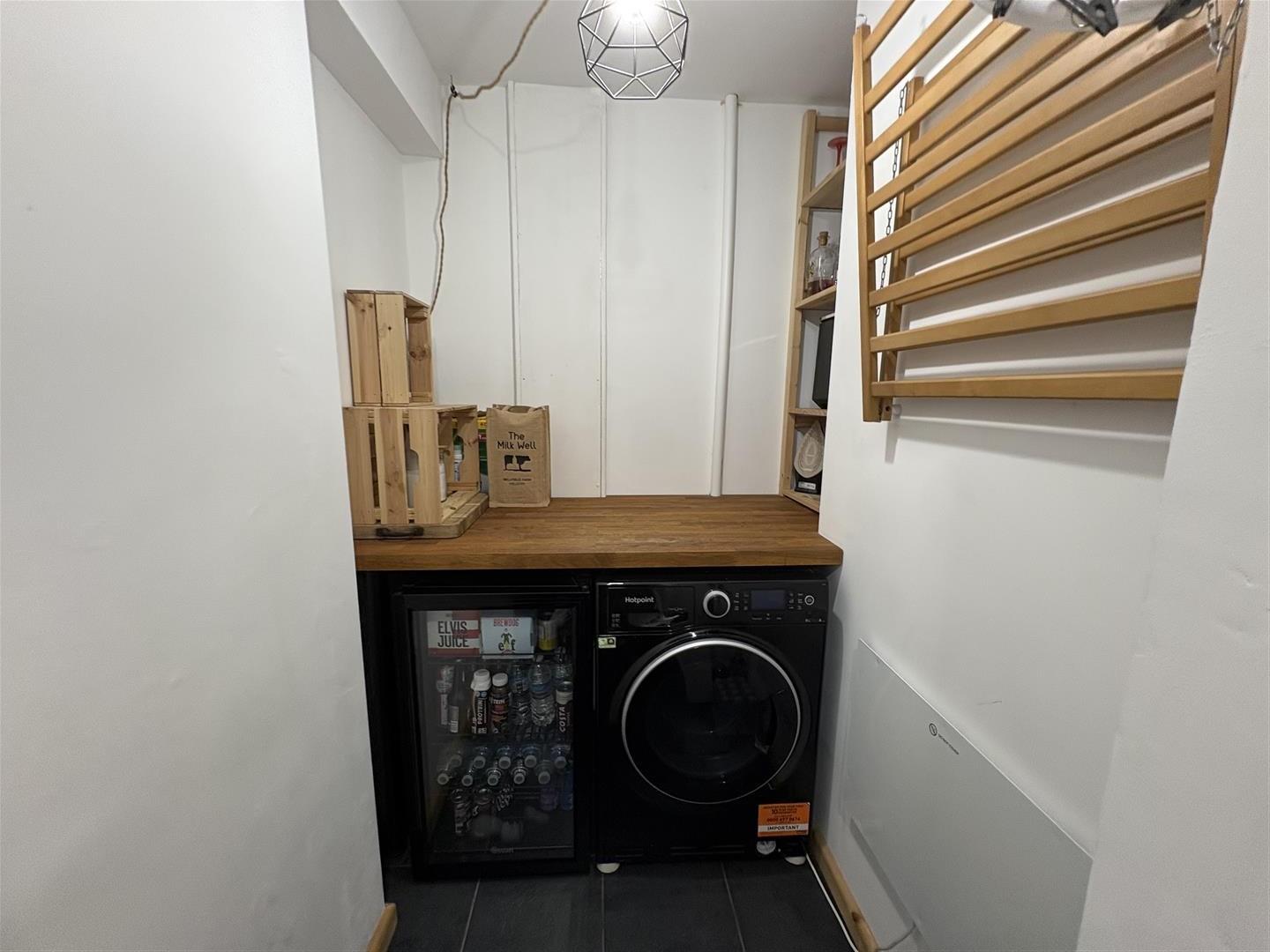 This area is extremely functional and makes the most out of the space, with plumbing for washing machine and wooden worktop this is an ideal laundry space with handy shelving to store additional appliances. This area has a wall mounted electric heater, lighting and sockets.