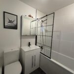 painted in white emulsion with white tiled splash back. White bathroom suite with storage vanity cabinet under the sink. Black accents to the shower screen and taps makes this room modern and inviting.