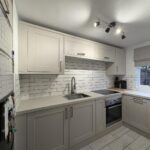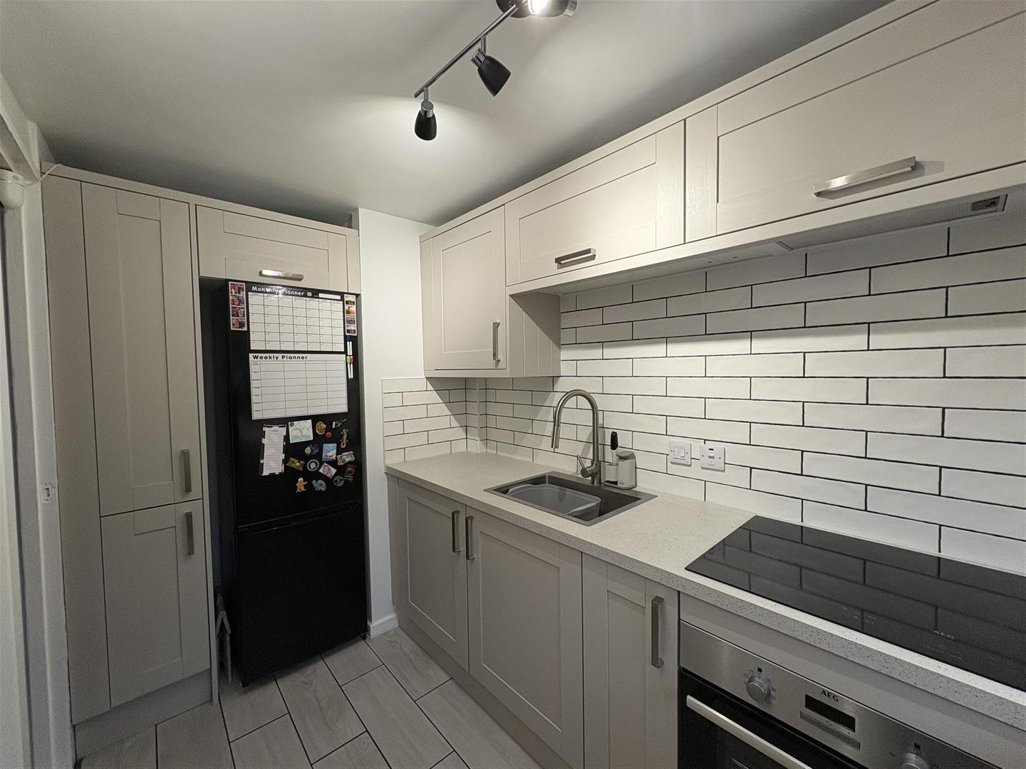 Pale grey shaker style kitchen with wall and base units, white counter tops with stainless steel accents. Integral oven and hob, stainless steel sink unit. The kitchen is compact however well designed to ensure it is functional and cosmetically appealing. White tiling above worktops and grey wood effect tiled flooring. The room has a window overlooking the rear garden and multiple electric sockets.